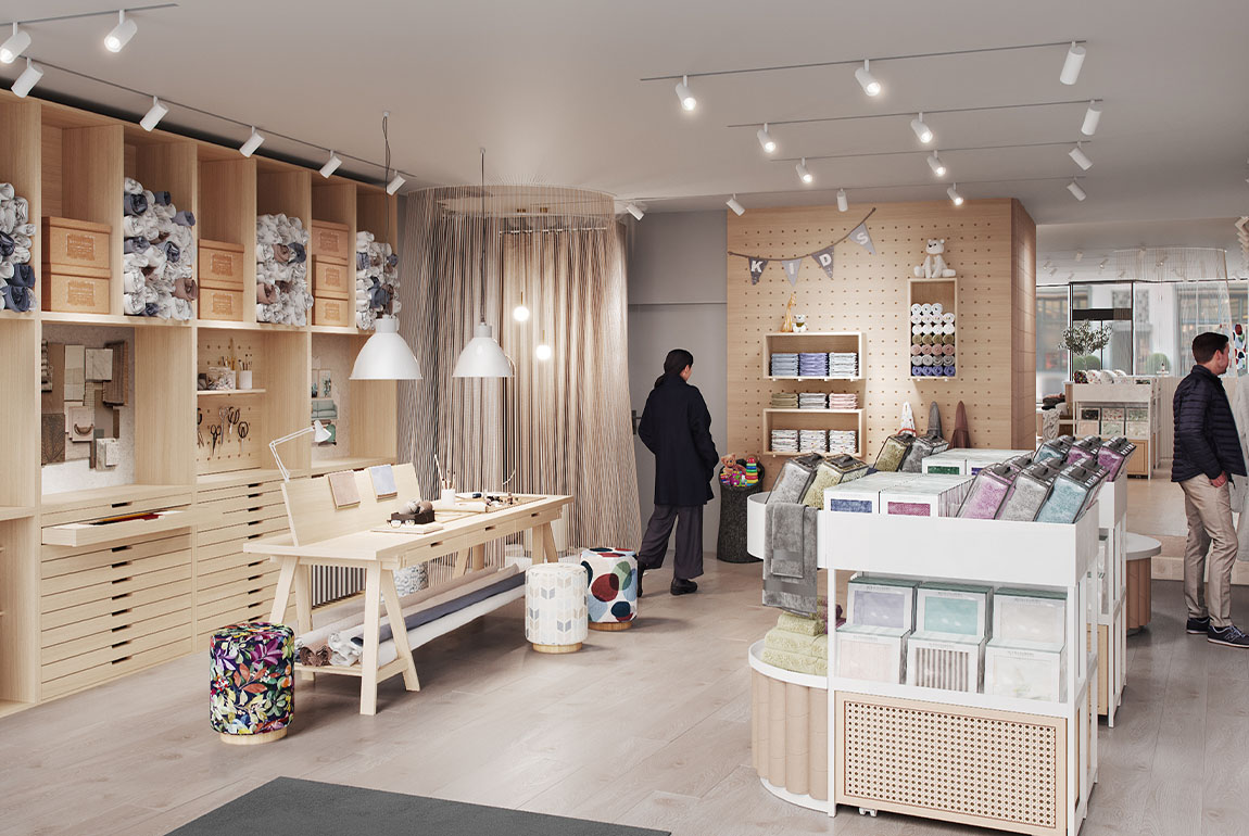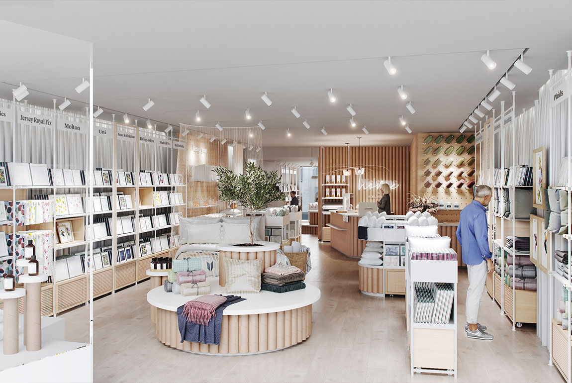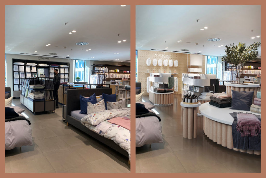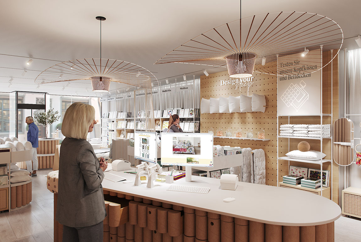 Schon wer eintritt, merkt: Hier wird Bettwäsche anders präsentiert. Cool, modern, persönlich. Im Zentrum steht das Atelier – hier können sich Kunden ein Bett selbst zusammenstellen. Analog, aber auch mit digitaler Hilfe. Abgerundet wird der Store durch ein nachhaltiges Trend-Design, das die Tradition des Unternehmens widerspiegelt.